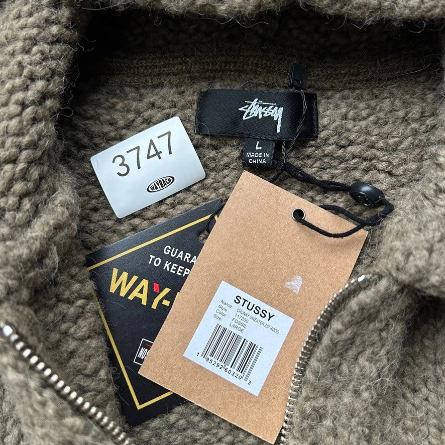 STUSSY | Fossil Green Hooded Alpaca Wool Full Zip Chunky Knit Sweater sz L NWT