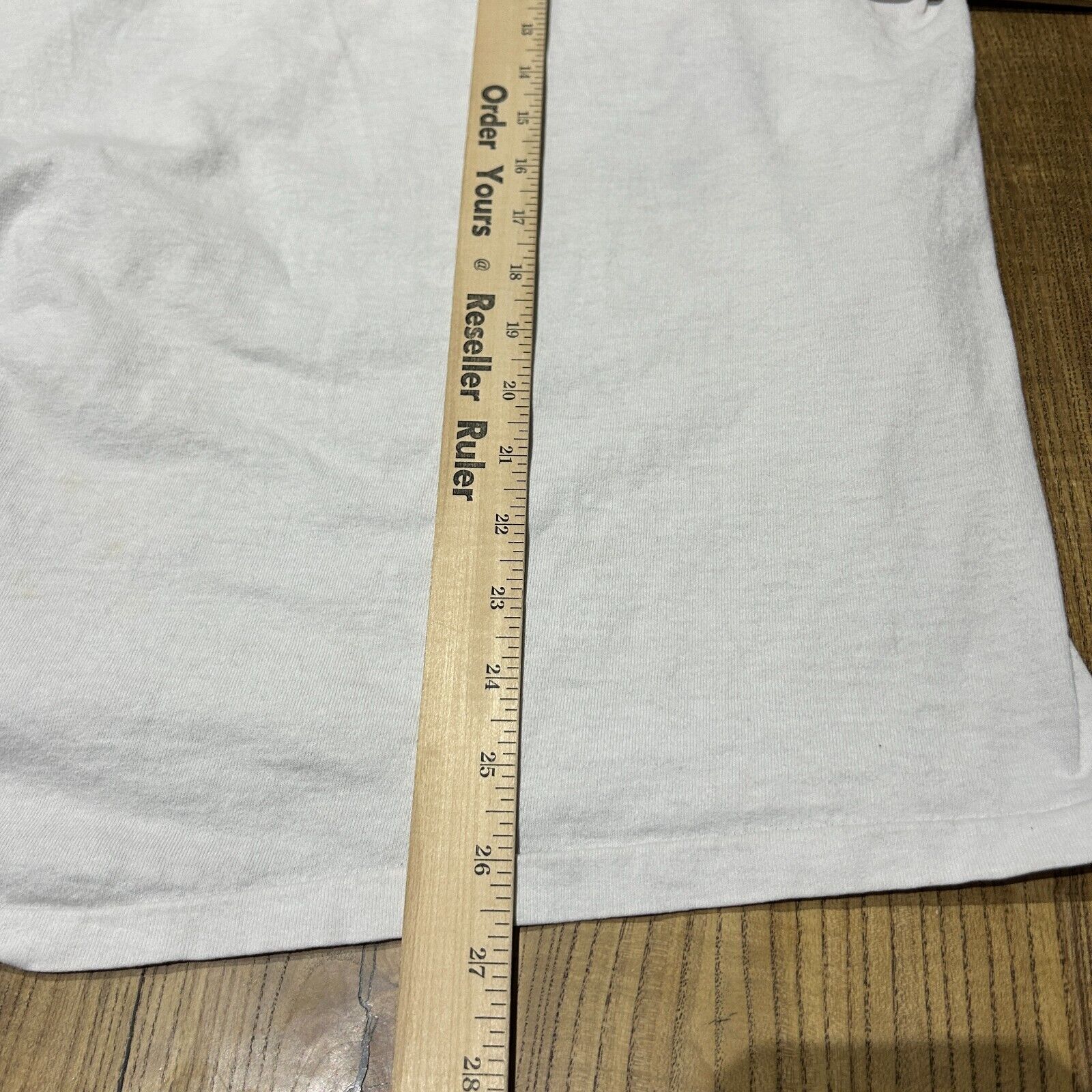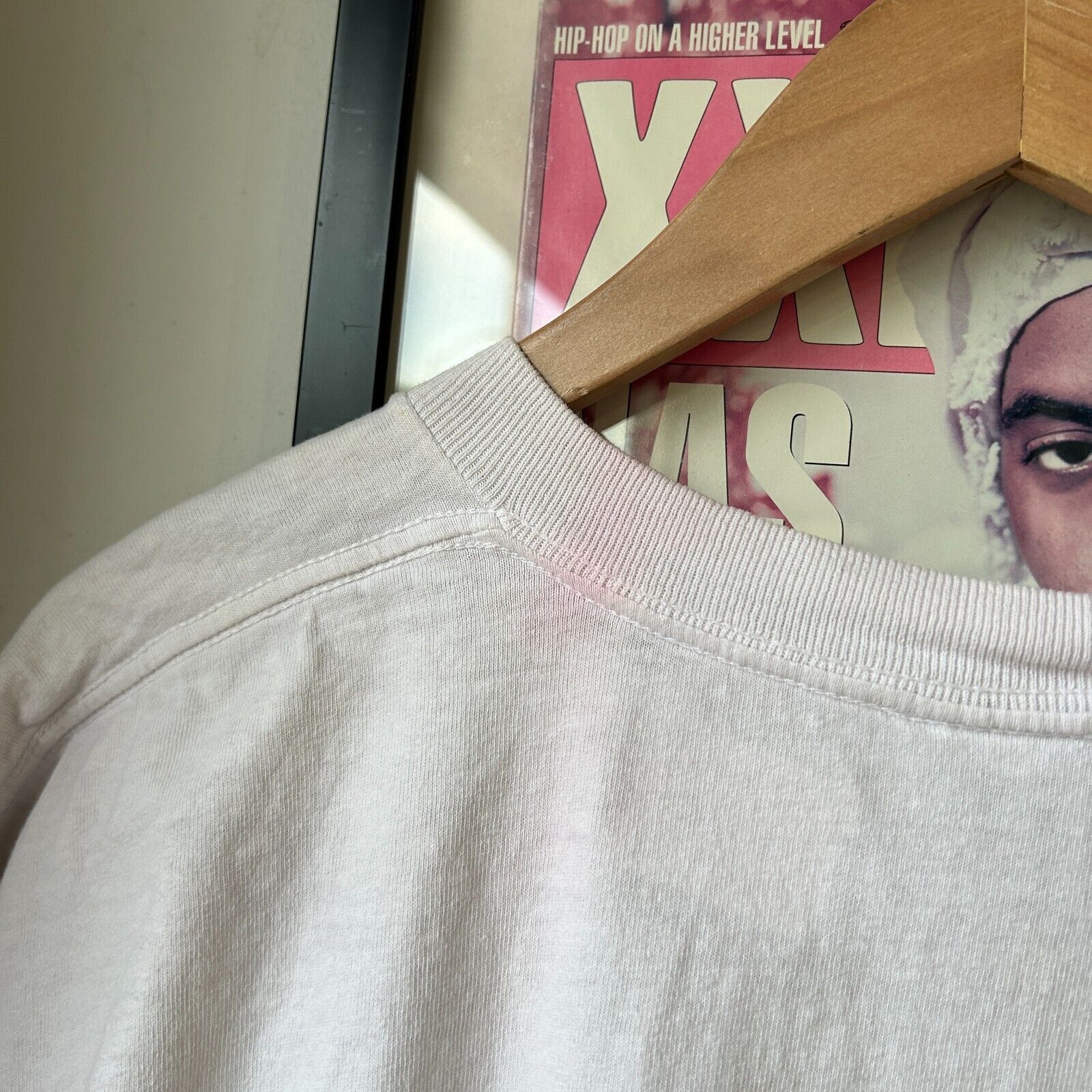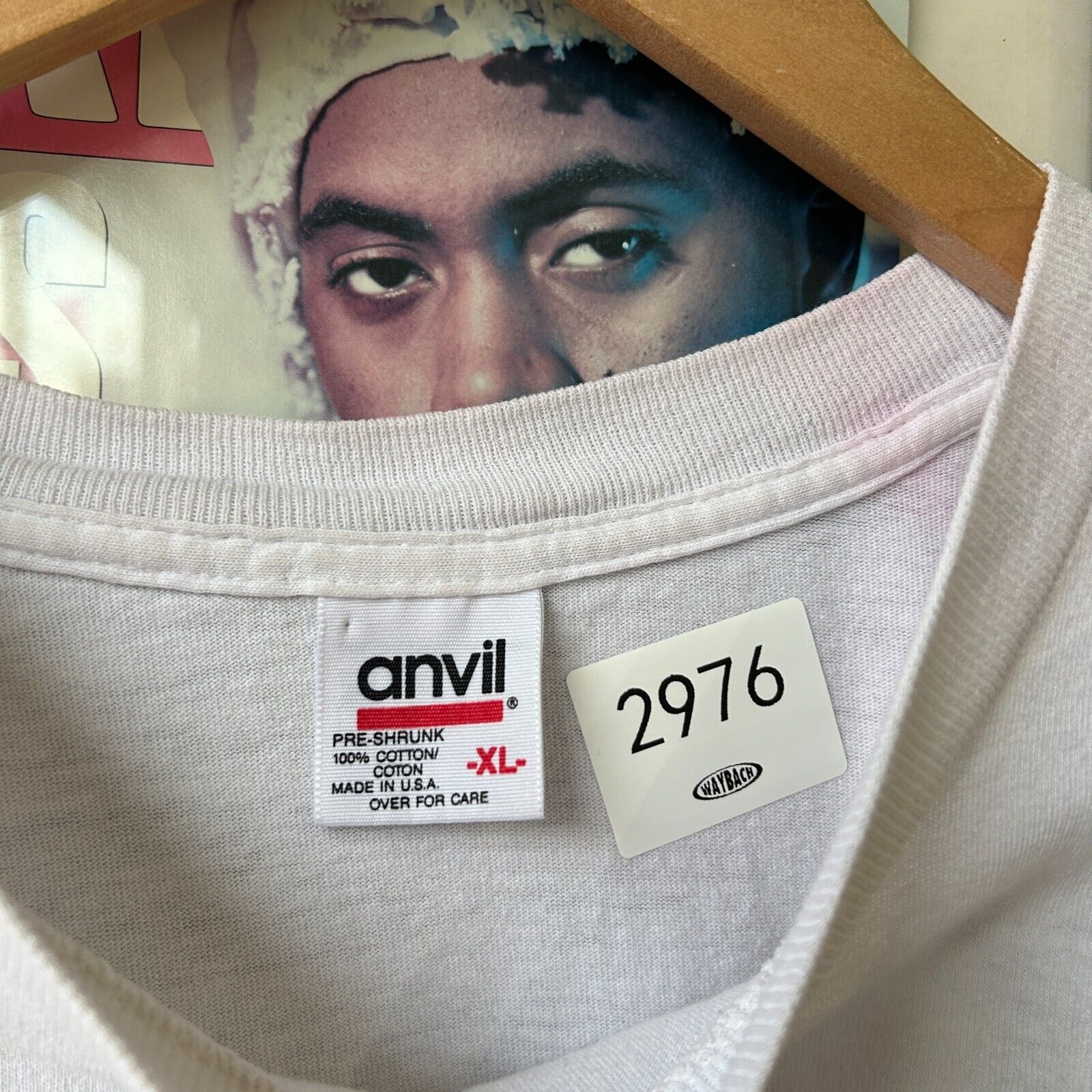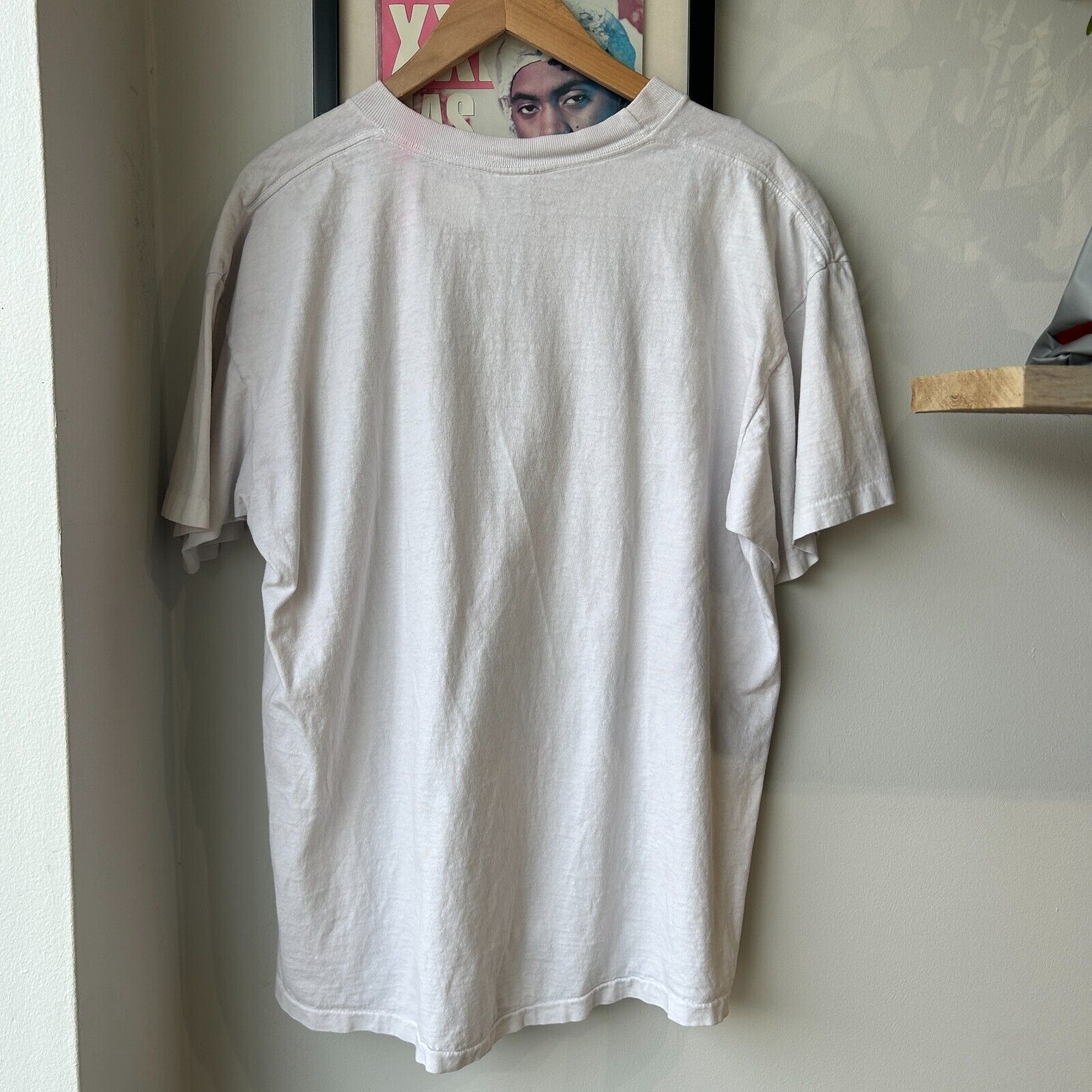 Faint marks throughout. Small tears/ holes on lower front. Pink bleeding on back neck and sleeve. Overall good distressed condition! *This shirt has been washed - Please review pictures*