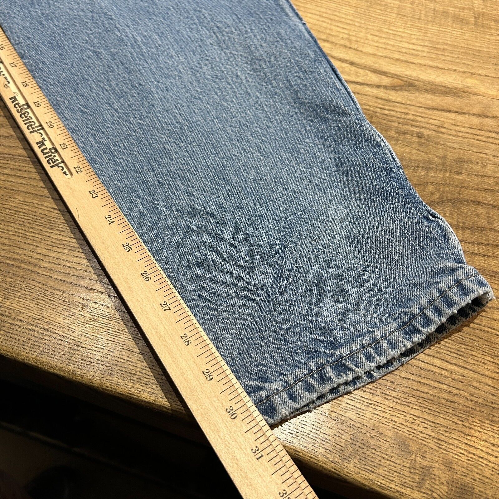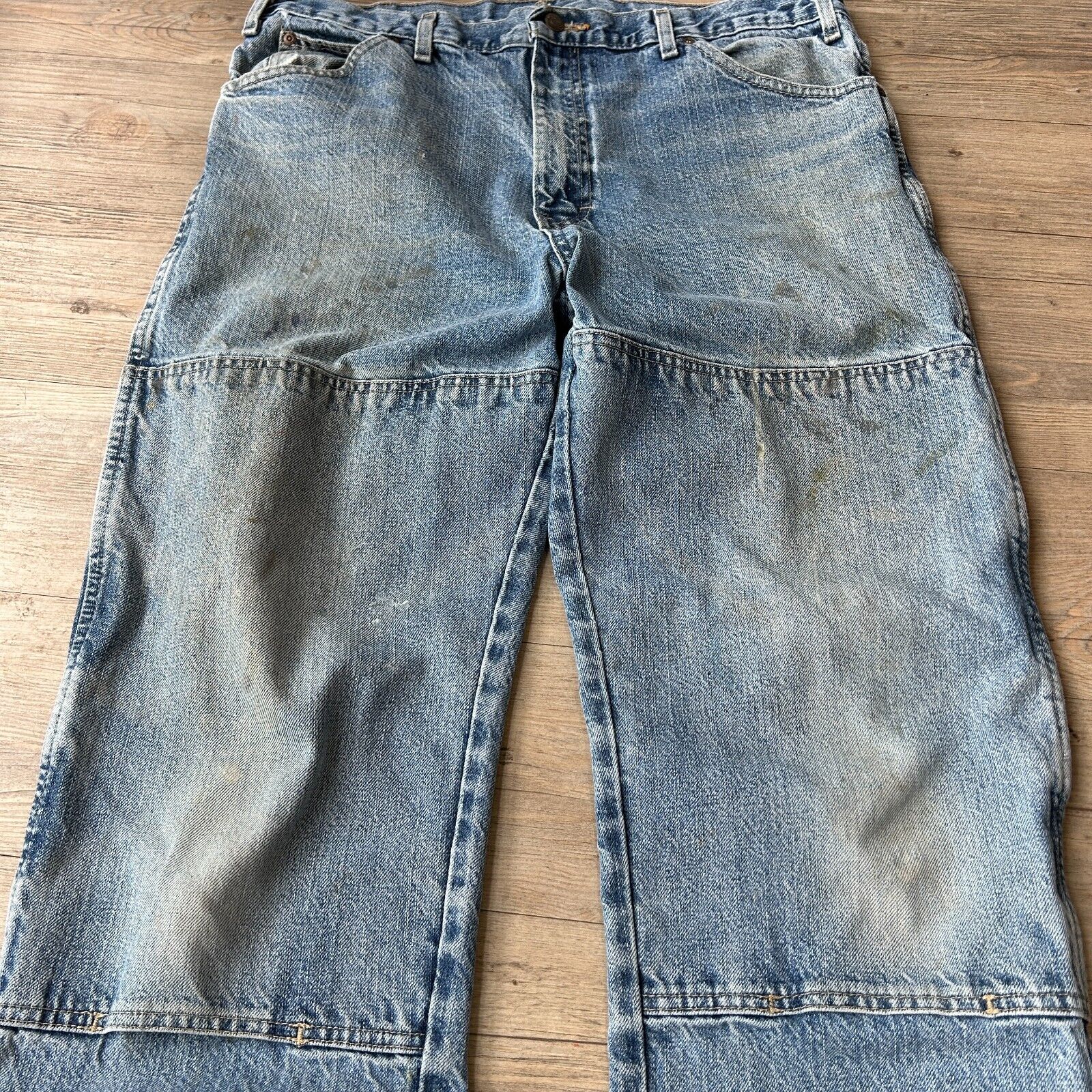 Wear and fading from age. Marks/ stains around front legs. Tear/ hole on back pocket. Light tears on bottom hems. Overall great distressed condition/ wear ! These pants have been washed* - Please review pictures*